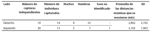Estimación de la densidad poblacional. Obtuvimos un total de 35 fotografías de ambos perfiles. Identificamos 14 individuos diferentes con el perfil derecho y 13 con el izquierdo (Tabla 1), por lo cual, utilizamos los primeros para llevar a cabo la estimación de la densidad poblacional. De éstos, fueron capturados cuatro machos y 10 hembras y se recapturaron a cuatro individuos diferentes. La frecuencia promedio de captura de los ocelotes fue de 18.2 capturas por 1,000 días trampa. El promedio de las distancias máximas viajadas por los ocelotes fue de 2,802 m (Tabla 1). Este promedio se basó solamente en las recapturas de dos individuos, ya que los otros dos individuos se recapturaron en los mismo sitios de su primera captura. El intervalo de las distancias máximas viajadas por los ocelotes fue de 1,252 a 4,352 m.