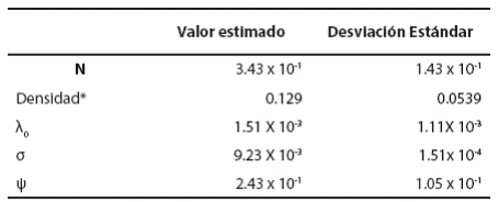 La densidad estimada fue de 12.9 ± 5.39 SE/100 km2. Los valores de λ0 (la tasa de detección que se espera si la trampa cámara se encontrara en el centro de actividad de los individuos) y ψ (probabilidad de que uno de los valores aumentados que representan individuos no capturados sea un individuo real) fueron de 1.51 x 10-3 ± 1.11 x 10-3 SE y 2.43 x 10-1 ± 1.05 x 10-1 SE, respectivamente (Tabla 2). De acuerdo a los valores de Geweke obtenidos, todos los parámetros convergieron (Tabla 3).