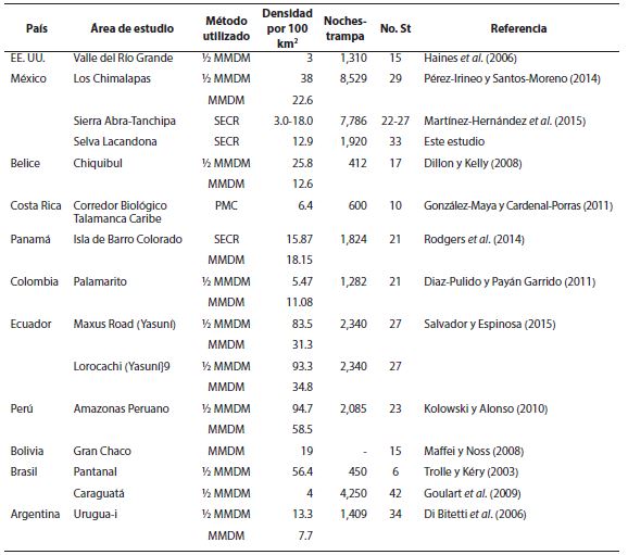 De acuerdo a las densidades registradas de las poblaciones de ocelote en diversas partes de su distribución, la densidad reportada en este estudio (12.9 individuos/100 km2), se encuentra dentro del intervalo de densidad reportado en la literatura (Tabla 4). La densidad estimada para la Selva Lacandona es similar a la obtenida por otros autores utilizando los modelos clásicos de captura-recaptura y utilizando la distancia media máxima viajada por los ocelotes para calcular el área efectiva de muestreo. Dillon y Kelly (2007) reportaron una densidad de 25.89 ± 7.92 ocelotes/100 km2 y de 12.61 ± 3.66/100 km2 ocelotes utilizando los métodos de captura-recaptura clásicos y agregando un buffer de 1⁄2 MMDM y MMDM, respectivamente, en Chiquibul en Belice. Asimismo, compararon los resultados con estimaciones obtenidas a partir de radio-collares para evaluar el desempeño de sus estimaciones y observaron que la distancia obtenida considerando 1⁄2 MMDM representa menos de la mitad del radio de la distancia máxima registrada con radio collares; esto sugiere que para especies con ámbitos hogareños amplios como los ocelotes, la consideración de un buffer de MMDM completo podría ser más acertado, y que utilizar solamente el 1⁄2 MMDM podría ocasionar una sobreestimación de las densidades poblacionales (Soisalo y Cavalcanti 2005; Dillon y Kelly 2007). Bajo este contexto, consideramos que nuestra estimación mediante los modelos SECR es adecuada debido a que se encuentra más cercana a las estimaciones obtenidas por medio de los modelos captura-recaptura clásicos que utilizan el MMDM para estimar el área efectiva de muestreo obtenidas en ecosistemas similares (Tabla 4).