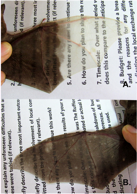 Consideramos que nuestro ejemplar presenta leucismo del tipo parcial (sensuMiller 2005, van Grouw 2012), ya que presenta desordenes de pigmentación en la mitad del dactilopatagio derecho y en los pelos del dedo I derecho (Figura 1A). La ausencia de la pigmentación es tal que se muestra transparente, incluso pudiéndose leer un texto a través del éste, mientras que los huesos muestran una tonalidad rosada debido a su irrigación sanguínea. El dactilopatagio izquierdo se muestra más claro en la parte distal y más oscuro cerca al cuerpo y presenta pequeñas manchas blancas dispersas (Figura 1B). El pelaje de la región dorsal del cuello y sobre las orejas presenta las puntas (1/3 terminal) con una coloración normal, mientras que la parte basal (2/3 basal) es blanquecina. No notamos anomalías en otras partes del cuerpo o a nivel craneal. La coloración del cuerpo en general no presentó mayor alteración en la coloración y los ojos tenían una coloración y apariencia normales.