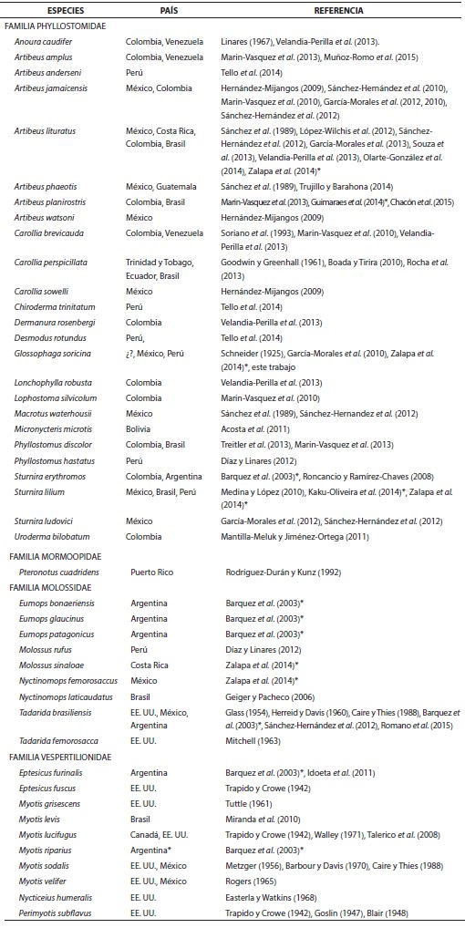 A la fecha, en América se han reportado 45 especies de murciélagos con leucismo (Tabla 1), la familia con más casos es Phyllostomidae (n = 25, 55.5 %), seguida de Vespertilionidae (n = 10, 22.2 %), Molossidae (n = 9, 20.0 %) y Mormoopidae (n = 1, 2.2 %). Las especies nectarívoras tienen menor cantidad de casos con tres especies, mientras que los frugívoros (16 especies) e insectívoros (21 especies) presentan mayor cantidad de casos. Los países con más especies reportadas con esta anomalía son México (n = 13), Colombia (n=12) y EE.UU. (n=9). La mayoría de los registros han sido publicados a partir del año 2000.