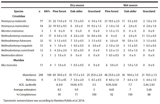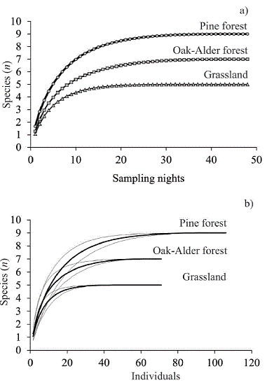 Rodent inventory completeness. Of the nine rodent species collected, the most abundant were Peromyscus melanotis (31%) and P. maniculatus (22 %; Table 1). Total species accumulation curves reach the asymptote after 33 sampling nights, but varied among vegetation types: 32 nights for the pine forest, 31 for mixed forest, and 20 for subalpine grassland (Figure 2a). According to the average for the non-parametric estimators, the level of inventory completeness was satisfactory (i. e., exceeded 90 %) only for the pine forest and grassland in the dry season and for pine forest and oak-alder in the wet season only (Table 1). We did not record recaptures of individually marked individuals.