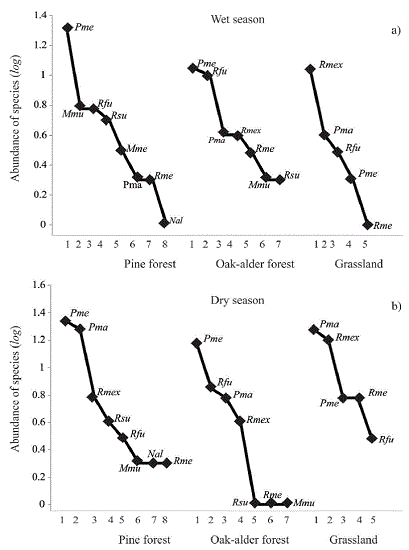 Rodent species dominance differed between vegetation types during the wet season (F2, 16 = 12.78, P = 0.0005). Rodent species in grassland were less diverse (5 species) than in pine forest (8 species P = 0.0005), or oak-alder forest (7 species P = 0.002). The arrangement of rodent species assemblages varied according to vegetation types and season. During the wet season, the most dominant species was P. melanotis in pine forest, but in comparison oak-alder forest had more dominant species (P. melanotis and R. fulvescens) than did pine forest and grassland (Figure 3a). Pine forest also registered the highest number of rare species (3 species), followed by oak-alder forest (2 species) and grassland (1 species).