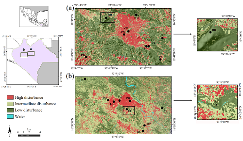 Disturbance levels. Three disturbance levels were selected in each landscape based on the matrix composition: L1, low disturbance, area consisting of a matrix of relatively continuous forest, with little or no influence of anthropogenic activities, or where such activities had been suspended for at least the last 15 years. The vegetation is undergoing a natural regeneration process. L2, moderate disturbance, this area includes both natural and anthropogenic elements, the matrix comprises productive activities, fragments of urban areas (housing, infrastructure), patches of native vegetation and vegetation in an early successional stage (acahual). L3, high disturbance, composed of an almost completely urbanized matrix plus areas with anthropogenic infrastructure (buildings, recreational activities, occupational activities, education and/or transportation). These areas include introduced and ornamental vegetation. From each disturbance level, three sampling sites or landscape windows were obtained (3 replicates × 3 disturbance levels per landscape), provided these shared similar characteristics in terms of land use and fragmentation.