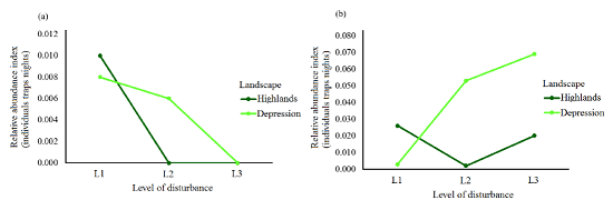 Abundance Distribution of Didelphis virginiana. The highest abundance was recorded in low- disturbance sites in the Highlands (11 specimens) and in high-disturbance sites in the Central Depression (24 specimens; Table 1). The mean relative abundance index (λ)for each landscape was 0.02 individuals per night per trap in the Highlands and 0.04 in the Central Depression. In particular, at the Highlands 0.03 individuals were recorded in L1, 0.002 in L2 and 0.02 in L3. In the Central Depression, relative abundance figures were 0.002, 0.05 and 0.7, respectively (Figure 2b).