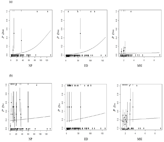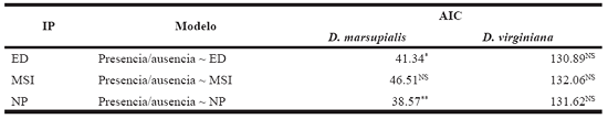 Landscape-Abundance Relationship The generalized linear models revealed a significant influence of the number of patches (p = 0.003) and edge density (p = 0.02) on the presence of D. marsupialis (Figure 3a). However, the evaluation of models with AIC showed that NP is the variable that best predicts the presence of this species (Table 2). For D. virginiana no significant relationship was found with any of the landscape characteristics considered (Figure 3b, Table 2). The ANCOVA also found no influence of SDI on the abundance of both species (p = 0.73). The linear regression showed no relationship between opossum abundance and disturbance level (p = 0.99), but it did reveal a significant relationship between abundance and landscape (p = 0.003). Finally, the linear regression with binomial error did not show a significant relationship between the number of D. virginiana specimens captured and the total number of opossum specimens captured (Didelphis spp.), in spite of having observed that the abundance of D. virginiana increased with the total number of opossum specimens (p = 0.08).