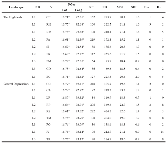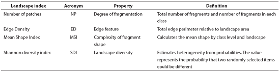 Landscape Indices. Sampling sites were geographically located in the landscape; afterwards, a circular area of 7.07 km2 and 1.6 km radius was outlined in each one. Each landscape was characterized by a total of nine sites (3 replicates × 3 disturbance levels; Figure 1). Landscape geometry (structure) was described in terms of the number of patches (NP), edge density (ED) and mean shape index (MSI), while landscape composition was evaluated in terms of the Shannon's diversity index (SDI). These indexes were selected because they assess landscape structure and heterogeneity, both of which may influence the abundance of mammals (Lambert et al. 2005; Badii and Landeros 2006; Altamirano et al. 2012; Garmendia et al. 2013; Appendix 1). Landscape characterization was carried out with the ArcGIS v. 10.2 software (ESRI 2011). Landscape indexes were calculated using the Patch Analyst plug-in for ArcGIS v. 10.2 (Rempel et al. 2012).