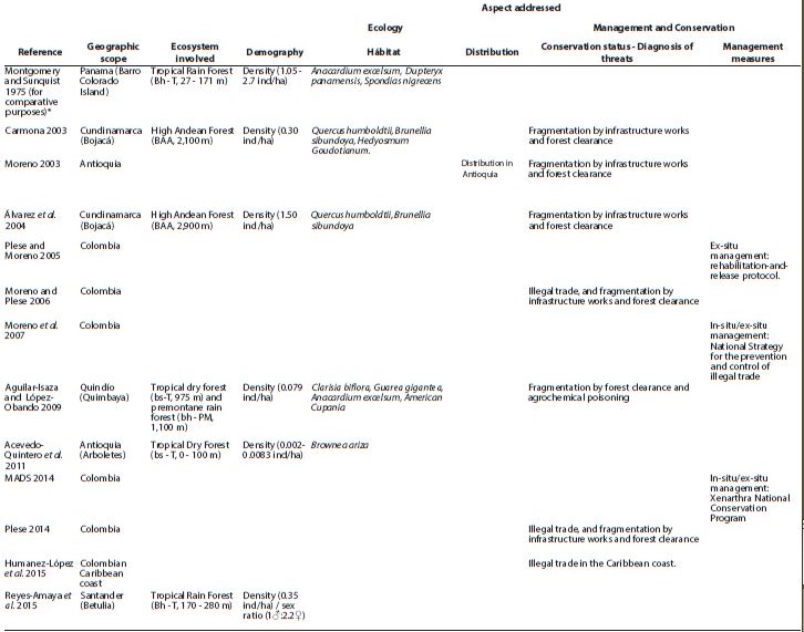 Studies conducted for this species in Colombia in the last two decades were gathered, and the contribution of each one to the knowledge of this species was analyzed. The studies reviewed were classified according to the biological aspect addressed: ecology (demography, habitat, distribution) or species management and conservation (conservation status - diagnosis of threats, management actions; Table 3). The findings of studies that addressed demographic aspects were compared with those in the first ecological investigation for this species in Panama (Montgomery and Sunquist 1975; Table 3).
