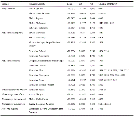 The sum of leucism records in Cordillera de Chilla plus the voucher specimens amounts to 38 individuals of eight species: Akodon mollis (n = 7), Nephelomys albigularis (n = 7), N. moerex (n = 18), Transandinomys talamancae (n = 2), Thomasomys auricularis (n = 1), T. taczanowskii (n = 1), T. paramorum (n = 1), and Mesomys hispidus (n = 1).