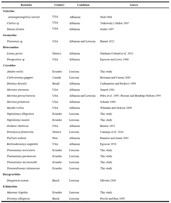 In Ecuador only two cases of color aberrations in small mammals are known, one albine Vampyrum spectrum specimen (Brito and Leon 2014) and one Carollia perpicillata specimen with leucism (Boada and Tirira 2010); information on these conditions for other mammals is unknown. This note reports the first cases of leucism for several species of Ecuadorian rodents distributed mainly to the southwest and other areas of the country.