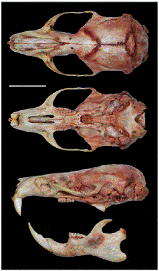 Externally, the specimen shows the following features: coat with a dark brown color dorsally and whitish with yellowish shades ventrally (Figure 4); pectoral region with a dark brown strip; thick and short mistacial whiskers that do not surpass the shoulder when bended backwards. The tail, longer than the head-body length, is thick, robust and densely covered with hairs, dark brown dorsally, while ventrally it is whitish to the medial region and dark brown distally (Figure 4). The hairs at the tip of the tail protrude 7.0 mm.