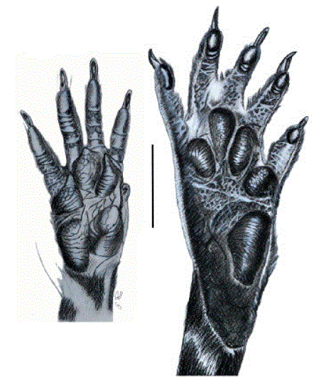 The front leg is medium-sized and thin; it has five fingers with claws, with the thumb being shortened with a short and rounded claw. The remaining fingers are relatively short, with enlarged and curved claws. Tufts of nail hairs cover 40 % of the claws in the hands. The metacarpal region is whitish with long dark brown hairs. The palmar surface shows five pads: the thenar and hypothenar pads are enlarged and separated by a small space; the three interdigital pads share a similar size, approximately 50 % of the thenar pad size (Figure 5).