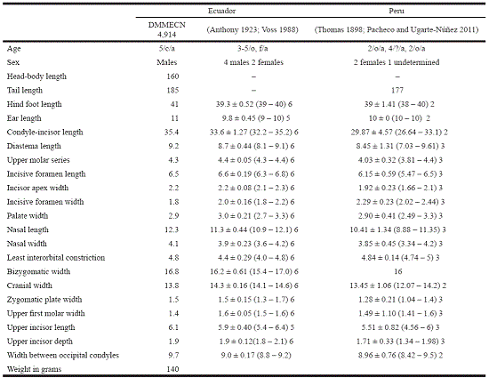 The reference specimen was deposited in the Mastozoology Division of the Museo Ecuatoriano de Ciencias Naturales, Quito, Ecuador (DMMECN 4,914), from which the skull was removed and cleaned with dermestid larvae; the body was preserved in 75 % alcohol. Cranial measures were taken with a digital gauge to the nearest 0.1 mm. The measures, body and cranial features were recorded following Voss (1988). Food items in the stomach contents were identified with a magnifying glass (Leica EZ4HD) at 35x.