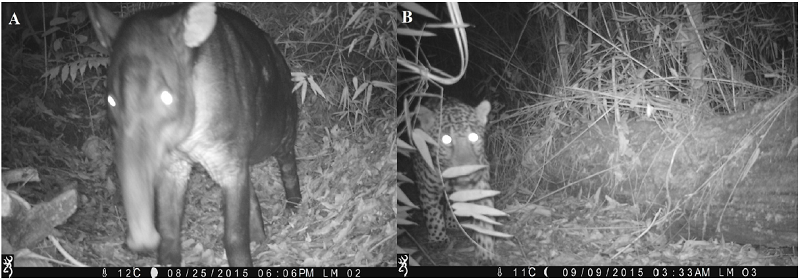 A total of 164 pictures where obtained from the three cameras, 30 of those were of one tapir in a single event (Captured on T2, 25 August 2015, 6:06 pm; 15.094903°, -86.726429°), this represents the 18.3 % of the total. Five pictures were of one jaguar in a single event (Captured on T3, 9 September 2015, 3:33 am; 15.095643°, -86.725163°), which represents the 3.05 %. Based on these images we could determine that the specimen of tapir is an adult male and the jaguar is an adult of unknown sex (Figure 2).