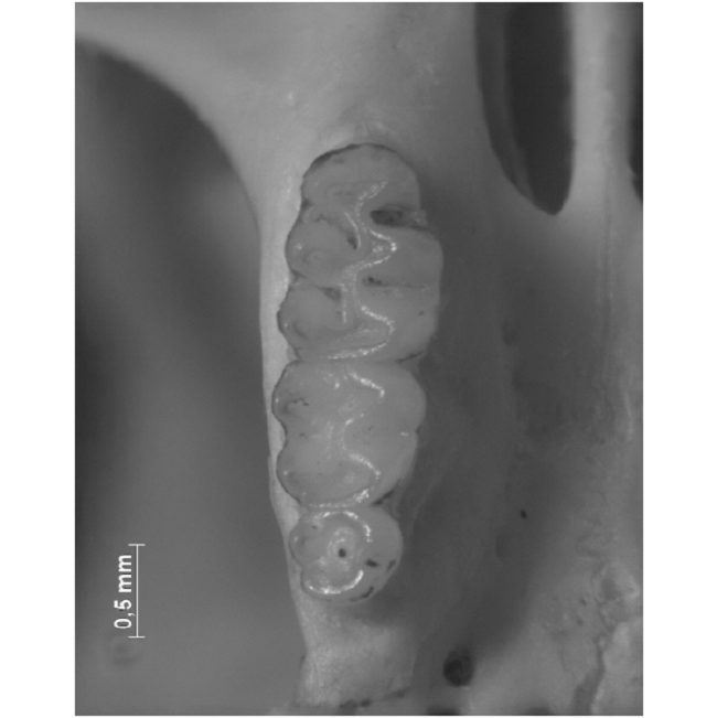 Importantly, however, MZUSP 25,729 differs from other specimens of C. hummelincki in some traits, including a shallow (or absent) anteromedian flexus on M1 (versus a deeply divided M1 in individuals of the type series); presence of an anteromedian style, a trait present in fewer than 10 % of the specimens studied by Olds (1988); and a wider-than-average incisive foramen. Finally, MZUSP 25,729 has an upper molar series with molar proportions (M1:M2 and M2:M3) somewhat different from those in populations farther north. Of special note is the proportionally larger M3 (ca. 75 % of M2) in the specimen from Roraima (Figure 2), when compared to C. hummelincki from other populations (ca. 70 % of M2).