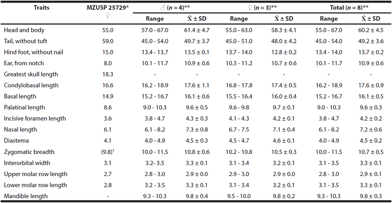 The new specimen is clearly a representative of the genus Calomys with body and skull measurements comparable only to those of C. laucha, C. tener and C. hummelincki (Table 1; see Bonvicino et al. 2010; Salazar-Bravo 2015). Moreover, based on the description in Salazar-Bravo (2015), MZUSP 25,729 exhibits all of the diagnostic external and craniodental characters of C. hummelincki, including grayish-orange dorsal pelage; mostly white ventral fur; distinct buffy post-auricular patches; weakly bicolored tail; short, narrow hind-feet covered with whitish hair; short and slender rostrum; shallow zygomatic notches; supraorbital region posteriorly divergent but not ridged; alisphenoid strut absent; greatest length of skull less than 21.0 mm; molar toothrow less than 3.3 mm (Figure 1). Other craniodental measurements for MZUSP 25,729 (Table 1) fall within the range of variation for this species.