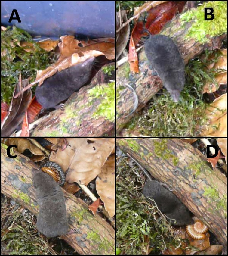 Abstract: The shrew Cryptotis aroensis from Sierra de Aroa, Venezuela, was recently described. Little is known on the natural history of the species. This note reports the first records on the foraging behavior of C. aroensis in captivity feeding on invertebrates and small vertebrates. We placed one individual previously captured in a pitfall trap inside a plastic box for ten days. We also added litter, log remains, bromeliads and mosses inside the box. Potential invertebrate and vertebrate preys were captured and placed simultaneously with the shrew to make observations on locomotion, posture, feeding preferences and prey manipulation. We supplied 17 invertebrate and two small vertebrate preys belonging to three phyla and seven classes during the period of captivity (Table 1). The foraging behavior consisted of sniffing the substrate and air (Figure 1A, B). The stalking behavior on prey consisted of rapid movements above or under the litter, and catches were made directly with the snout (Figure 1C, D). Handling prey for consumption involved tearing, cutting and chewing a small portion; the same pattern was repeated until the prey was consumed completely. Cryptotis aroensis consumed a variety of prey, but it showed no apparent preference for any prey, contrary to what was reported for C. meridensis in Merida, Venezuela (Woodman and Diaz de Pascual 2004). C. aroensis differed from C. meridensis in the search and capture strategies, but coincided with C. parvus (Whitaker 1974). Although the information reported in this note should not be taken as conclusive because it derived from a single individual under inadequate study conditions; nonetheless, it represents the first record on the behavior of the species in captivity.