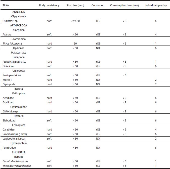 Potential preys were divided into three categories: soft body and size < 50 mm; hard body and size < 50 mm; and soft or hard body and size >50 mm. Prey items were placed inside the box simultaneously (every two hours from 18:00 until 06:00 hours). Most of them were offered in equal amounts, every day, and visual records were made simultaneously with a digital camera to document locomotion, posture, food preferences and prey manipulation.