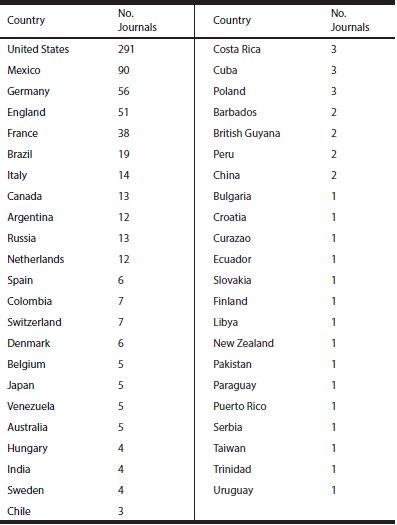 Source and situation of journals. Of the 702 journals, 86.3 % (n = 606) are published in the United States of America, Mexico, Germany, United Kingdom, France, Brazil, Italy, Russia, Canada, Argentina and The Netherlands; other 34 countries represent a mere 13.7 % (n = 96), with a number of journals that range between 1 and 8 per country (Table 1). In particular, 41.5 % comes from the United States of America (n = 291), 12.8 % (n = 90) from Mexico, followed by Germany (n = 56; 8.0 %), United Kingdom (n = 51; 7.3 %), France (n = 38; 5.4 %), Brazil (n = 19; 2.7%), and Italy, Russia, Canada, Argentina and The Netherlands (n = 64; 9.1 %).