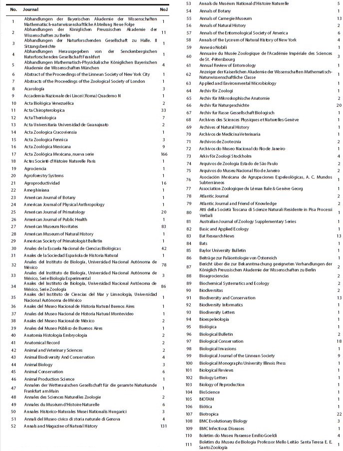 In spite of the historical fluctuations in the production of works, the 6,732 references contributing to the knowledge of the terrestrial mammals of Mexico have accumulated over a little more than 360 years; of these, 81.2 % (n = 5,467) were published in 702 journals from 45 countries. Of the rest, 9.1 % (n = 610) are book chapters, and 9.7 % (n = 655) specialized books. All references were physically reviewed at least once. Exceptions are seven old publications from the 18th and 19th centuries that could not be located and, hence, were excluded from this study (Appendix I).