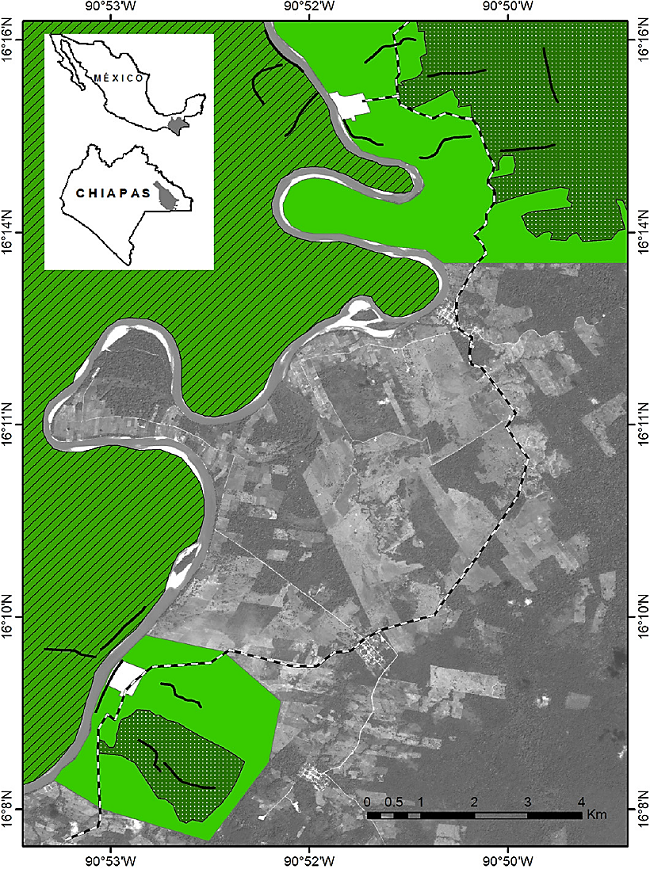 Study area The study area included a southeastern portion of Montes Azules Biosphere Reserve (MABR) and territories of two neighboring communities (ejidos): Playón de la Gloria (pop = 209), and Reforma Agraria (pop = 145) in the Lacandon Rainforest of Chiapas, Mexico. Both communities are located on the east side of the Lacantun River (INE 2000; INEGI 2010). Three habitat types were considered in this study: 1) Transformed landscapes, including secondary vegetation along rivers and within agricultural and grazing areas, and human settlements. Human presence in this habitat type was continuous; 2) Community reserves, established by local residents for conservation in Reforma Agraria (14.6 km2) and Playon de la Gloria (2.5 km2). Both reserves are primarily covered by secondary forest, abandoned plantations, and rainforest fragments. Tourism and research are present in these reserves for relatively short periods (a month or less); 3) Montes Azules Reserve, where undisturbed mature rainforest is predominant. Human activity is negligible in this site, where only a few researches and visitors are allowed (Figure 1).