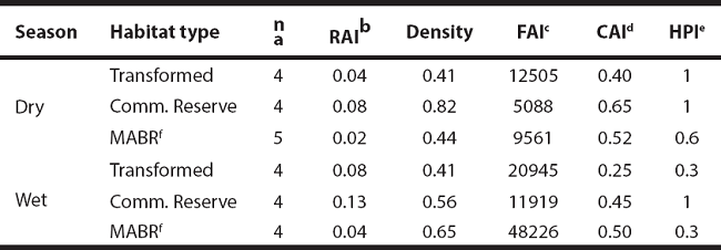 Food availability for pacas was estimated under the crown of 297 trees of 30 species, of which 5 species produced fruit in the dry season, 16 in the wet season, and 8 in both seasons. A lower food availability was found in the dry season compared to the wet season (W = 125, P = 0.009). Nonetheless, there were no differences among habitat types (P > 0.05; Table 1). Cavity availability was similar between seasons (W = 61.5, P = 0.4), and among habitat types (P > 0.05; Table 1). Similarly, we detected no seasonal (X2 = 0.04, P = 0.8) or habitat-based (P > 0.05; Table 1) differences in the numbers of persistently hunted versus slightly hunted transects in the study area.