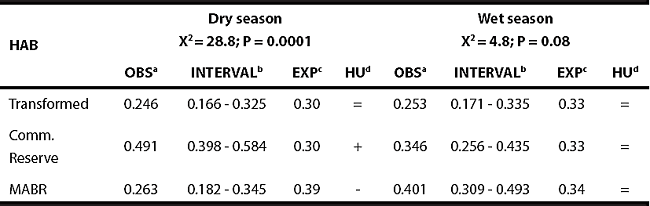 Paca relative abundance was no significantly affected by food and cavity availability, hunting pressure or abundance of competitors and predators (Appendices 3 and 4). Contrastingly paca density was positively correlated with cavity availability (dry season: r = 0.15, P = 0.04; wet season: r = 0.22, P = 0.006). In the dry season, pacas used the transformed landscape in proportion to its availability, the community reserve more than expected, and MABR less than expected. However, during the wet season the three habitat types were used by pacas in proportion to their availability (Table 2).