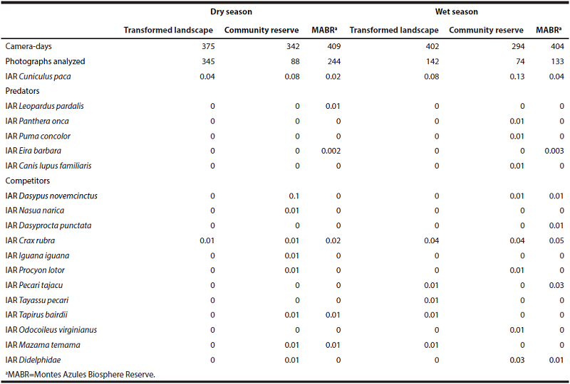 Potential paca competitors recorded by photo-trapping in MABR were: Red brocket deer, Baird's tapir, collared peccary, nine-banded armadillo (Dasypus novemcinctus), agouti (Dasyprocta punctata), opossums (Didelphis spp., Philander opossum, and Metachirus nudicaudatus), and great curassow (Craxrubra). In the community reserve we detected the white-tailed deer, red brocket deer, Baird's tapir, raccoon (Procyon lotor), coati (Nasua narica), nine-banded armadillo, opossums, great curassow, and green iguana (Iguanaiguana). In the transformed landscapes, the red brocket deer, Baird's tapir, collared peccary, and great curassow were registered. Potential predators detected through photo-trapping in MABR were the ocelot and tayra; the jaguar, puma, and dogs were recorded in the community reserve, and no predators were recorded in the transformed landscape.