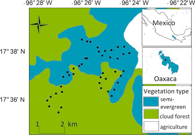 Study area. The study area is located in the Sierra Norte region, Oaxaca, Mexico, in the community of San Isidro Yolox (17° 38' N, -96° 25' W; Figure 1). The region is part of the Sierras Norte-Mixe Oaxaca Priority Land Region (Arriaga et al. 2000). The climate is warm and humid. Mean annual temperature varies from 16 °C to 26 °C and precipitation ranges from 2500 to 4000 mm (Trejo 2004). The rainy season stretches from July to December, but there is rainfall throughout the year. The dominant vegetation types are semi-evergreen forest and cloud forest. Semi-evergreen forest areas alternate with agriculture land, pastures, open areas and human settlements. Cloud forests show little fragmentation and human intervention, being among the best preserved areas of natural vegetation in Mexico (Arriaga et al. 2000).