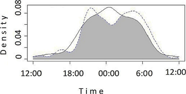 Ridout, M. S., and M. Linkie. 2009. Estimating overlap of daily activity patterns from camera trap data. Journal of Agricultural, Biological, and Environmental Statistics 14:322-337.
