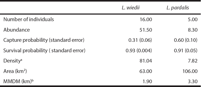 Of these 16 individuals of L. wiedii identified, four were females, four males and eight of indeterminate sex. We recorded two different cubs following the female closely. In the first case (27 January 2015; 05:29), the body size of the cub was about one-third of the body size of the female. In the second (2 February 2015; 05:57), the body size of the cub was similar to that of the female, and perhaps it was one year old. In the case of L. pardalis, two were females, two males and one of indeterminate sex. A female with its cub was recorded once (11 July 2014, 23:40 h). The cub followed the female closely, and its body size was about half the body size of the female, so it likely was less than one year old. Fifty six percent of individuals of L. wiedii and 40 % of individuals of L. pardalis were recorded for a month in the area. One female of L. wiedii had the longest residence time (12 months) and the mean residence time was 4.4 ± 1.4 months. One male of L. pardalis remained in the zone for 13 months and the mean residence time was 5.17 ± 2.3 months.