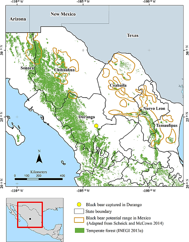 In Mexico, the black bear is considered a species endangered in risk of extinction throughout most of its distribution range (DOF 2015), an area that was significantly reduced largely due to the impact of anthropogenic factors during the twentieth century. The presence of the species in the southern area of its distribution range in Mexico is characterized by a low number of records, and the precise limits of this range are still unknown (Delfín-Alfonso et al. 2011; Delfín-Alfonso et al. 2012; Scheick and McCown 2014). On April 2014, one black bear specimen was captured by local inhabitants in Felipe Carrillo Puerto, a town located in the municipality of Guadalupe Victoria, state of Durango. Durango is one of the states where there is a high uncertainty about the presence of the black bear (Delfín-Alfonso et al. 2012; Juárez-Casillas and Varas 2013); prior to this capture, there had been no recent records of the species in the area (Delfín-Alfonso et al. 2011). The presence of the specimen in this locality raise questions about its geographical origin, whether associated with the Sierra Madre Occidental or the Sierra Madre Oriental. This specimen brought the unique opportunity to investigate the possible existence of a recent connectivity event between both regions; accordingly, our aim was to determine the geographic origin of the black bear specimen by characterizing its haplotype.