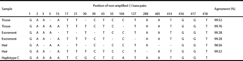 The DNA from the six samples of the black bear specimen were successfully amplified (Table 1); thus, all were used in the haplotype characterization analysis. The neutrality test yielded a single haplotype. Sequences of 418 base pairs were obtained and the number of base pairs that were not amplified per sample ranged from 1 to 6. Considering these base pairs as unknown, our samples yielded an agreement of 99.32 % ± 0.41 (std dev.) with haplotype C described by Onorato et al. (2004) (Table 1).