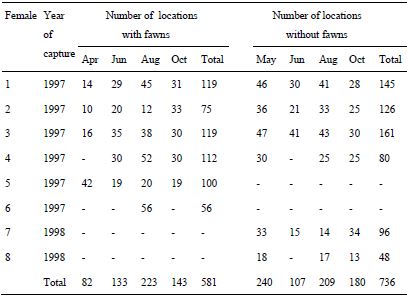 Eight females were captured, six in 1997 and two in 1998 (Table 1). Three were captured within the 1,000 ha confinement area, and five outside of this area. The six females monitored in 1997 were raising fawns. The six females monitored in 1998 had no fawns.