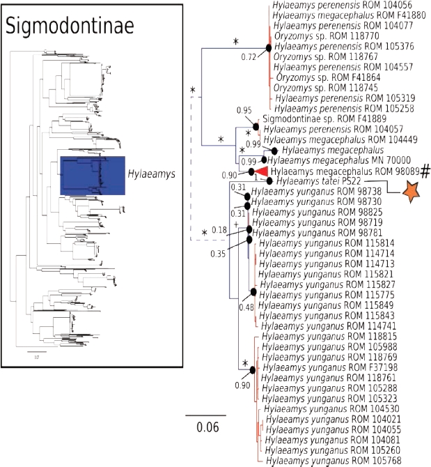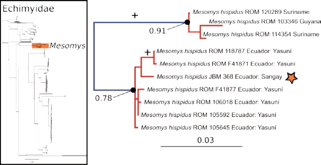 The maximum likelihood gene tree of the family Echimyidae — tree B — (Figure 3) contained 281 unique terminals, and the maximum likelihood PTP analysis of species delimitation returned 42 candidate species. The sample of Mesomys from the eastern slopes of the Andes is nested with sequences of Yasuní National Park from the lowlands of the Ecuadorian Amazonia, confirming that both populations likely correspond to the same species (Figure 3).