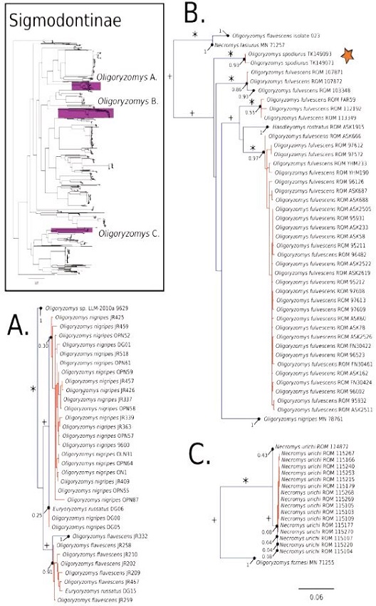 Following the analyses of González-Ittig et al. (2014) we preliminarily recognize the Oligoryzomys of the western slopes of the Ecuadorian Andes as O. spodiurus; these populations were traditionally regarded as part of the widespread O. destructor (Weksler and Bonvicino 2015). We also recovered Oligoryzomys as paraphyletic, but we propose that this may be due to two artifacts: incorrect identifications of various voucher specimens associated with sequences available in GenBank (sequences of specimen MN71255 [GenBank accession number: KF815407] (Figure 4C) actually belongs to Necromys lasiurus, based on the analysis of CYTB of the same specimen,results not shown); and putative pseudogenes (Numts; Bensasson et al. 2001) in sequences generated by Müller et al. (2013) [GenBank accession numbers: GU938877, GU938878, GU938886-GU938890, GU938892-GU938894, GU938898, GU938899, GU938953, GU938969-GU938988] (Figure 4A), based on the position of these sequences in an analyses of a larger data- set of Oligoryzomys barcodes (M. Weksler et al., in prep.). Traditionally, the genus Oligorzomys has been a hard group to study because of the availability of a large number of taxonomic names and various difficulties inherent in assessing patterns of morphological variation. Fortunately, there have been new efforts to generate a more comprehensive understanding of the diversity in the genus (Weksler and Bonvicino 2005, 2015; González-Ittig et al. 2014; Weksler et al. 2017). Our barcode data corroborate the sister relationship of Oreoryzomys, a poorly studied Andean genus, and Microryzomys (Weksler 2006).