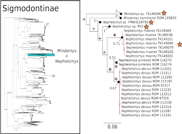 The COI gene tree of the subfamily Sigmodontinae (tree C; Figures 4 to 7) consisted of 1,020 unique sequences, and the maximum likelihood species delimitation returned 153 candidate species. The genus Oligoryzomys was recovered as polyphyletic. The Otonga samples of Oligoryzomys destructor are sister to a clade of Oligoryzomys species including 6 candidate species within O. fulvescens and a sample identified as O. nigripes (Figure 4). The genera Mindomys and Nephelomys form a monophyletic group. However, the genus Mindomys (M. hammondi and an undescribed Mindomys from Otonga) was not recovered monophyletic (Figure 5). The specimens of Nephelomys from Sangay National Park might correspond to two different species, with a divergence of 5.6 %, and Nephelomys moerex from Otonga is sister to two Nephelomys species from Central America (Figure 5). The genus Hylaeamys was recovered as monophyletic and H. tatei was nested well inside the genus, as sister to a clade comprised of 6 candidate species currently identified within H. yunganus (Figure 6). Both species of Rhipidomys from Ecuador form a monophyletic group sister to a clade formed by R. scandens, R. leucodactylus (2 putative species), and R. nitela (Figure 7).