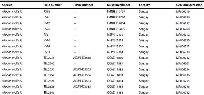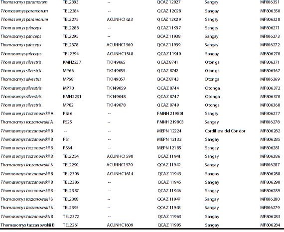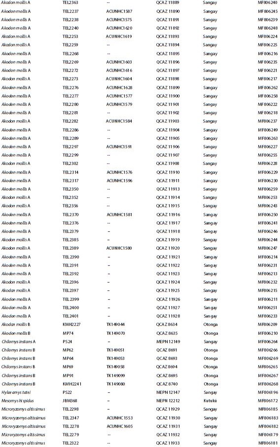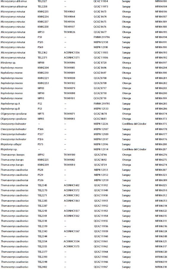 Sampling. We used selected samples of 21 species of rodents, primarily identified on the basis of morphological characters, collected in two Andean forests: Otonga, a private forest reserve located in the western slopes of the Andes in the province of Cotopaxi in northern Ecuador (Jarrín 2001), and Sangay National Park located in the eastern slopes of the Andes in the provinces of Chimborazo, Morona Santiago and Tungurahua in south-central Ecuador (Armstrong and Macey 1979; Fonseca et al. 2003; Figure 1). Three different field parties collected voucher specimens with tissues during 2006 in Otonga, and during 2010 and 2012 in Sangay. Morphological identifications of all specimens were conducted using specialized taxonomic literature (e. g., Carleton and Musser 1989; Weksler 2006; Patton et al. 2015), and by side-by-side comparisons with voucher specimens from the following collections: Abilene Christian University (ACUNHC) in Abilene, Texas, USA; American Museum of Natural History (AMNH) in New York, New York, USA; Escuela Politécnica Nacional (MEPN) in Quito, Ecuador; Museo Ecuatoriano de Ciencias Naturales (MECN) in Quito, Ecuador; National Museum of Natural History (NMNH) in Washington DC, USA; and Pontificia Universidad Católica del Ecuador (QCAZ) in Quito, Ecuador. Some previous findings of the mammals collected by these parties have been reported elsewhere (Lee et al. 2011; Helgen et al. 2013; Ojala-Barbour et al. 2013; Brito and Ojala-Barbour 2014; Brito et al. 2014; Brito et al. 2017). Examined specimens are housed at different mammal collections as indicated in Appendix 1.