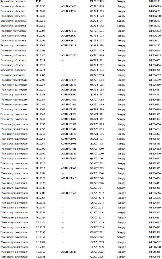 Our results indicate that the alpha taxonomy of the tropical Andean rodents is still not fully resolved, for example with respect to delineation of species in the genera Chilomys and Mindomys. Also, COI sequences that we have obtained for the genera Thomasomys and Chilomys provide the first data from this marker for these genera, and may be useful for onward rodent barcoding efforts and for efforts toward a comprehensive multilocus phylogeny of thomasomyines, which remains an outstanding goal in Neotropical mammalogy (Salazar-Bravo and Yates 2007; Lee et al. 2011, 2015). While acknowledging its limitations, we encourage research teams studying Neotropical rodents to provide DNA barcoding data whenever possible, which may help to speed new species discoveries and taxonomic reviews in a highly diverse order in which many lines of basic taxonomic and inventory research remain open, active, and fruitful.