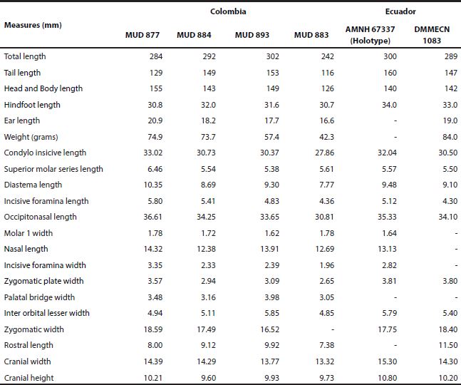 The N. nimbosus specimens were deposited in the mammal collection of the Universidad Distrital Francisco Jose de Caldas (MUD) in Bogota, Colombia. Analyzed specimens (MUD 877; MUD 883; MUD 884; MUD 893) were compared with the holotype of N. nimbosus (American Museum of Natural History, AMNH 67337; Anthony 1926; Percequillo 2003), and a specimen of this species from south eastern Ecuador deposited in the Ecuadorian Museum of Natural Sciences (DMMECN 1083; Brito et al. 2015). Also, specimens were compared with individuals of N. childi (MUD 876; MUD 876; MUD 880; MUD 887; MUD 889). Body and cranial measures were taken with a gauge ± 0.1 following the definitions of Voss (1988) and Patton et al. (2000).