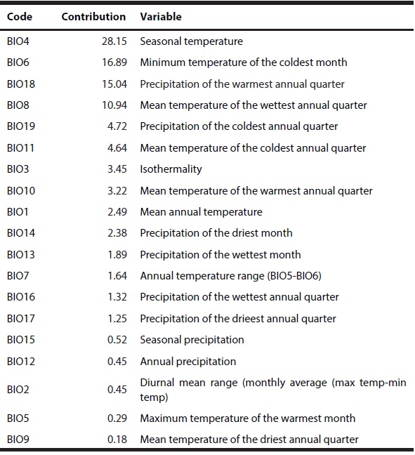 Potential Distribution. An AUC of 0.969 (min = 0.945, max = 0.98, σ = 0.007, n = 50) and a AUC ratio of 1.89 ± 0.04 (P < 0.05) were obtained. Fourteen variables with a significant contribution to the model were identified (Table 1); however, variables BIO1, BIO3, BIO7, BIO8, BIO10, BIO11, BIO13, BIO16 and BIO17 were eliminated for being highly correlated (Figure 3). Five non-correlated bioclimatic variables made a significant contribution to the model; seasonal temperature (BIO4) and minimum temperature of the coldest month (BIO6) accounted for 82.7 %, whereas precipitation of the fourth warmer quarter (BIO18), precipitation of the fourth annual quarter (BIO19), and precipitation of the driest month (BIO14) contributed 17.3 %.