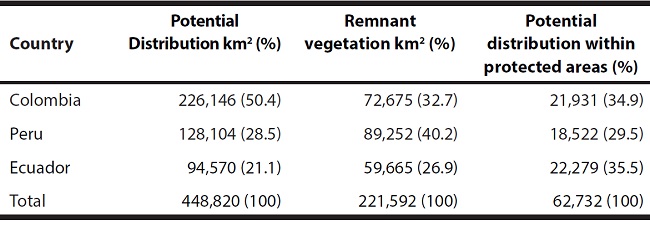 Although Colombia is the country with the greatest portion of the potential distribution of the stump-tailed porcupine, when evaluating the proportion related to remnant vegetation, Peru comprises 20 % of the remaining distribution with respect to this variable, being the country with greatest coverage for the species. For its part, Colombia shows highly fragmented habitats in the western, central and eastern foothills (SIAC 2017), similar to Ecuador, which also faces threats related to habitat fragmentation in the Andes (Ministerio del Ambiente del Ecuador 2013; Lozano et al. 2006). However, the presence of continuous protected areas in Ecuador — mostly in the eastern slope — may ensure the mid-to-long-term permanence of the species.