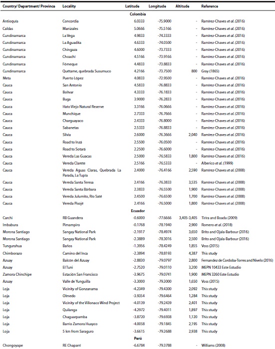 New localities. In addition to the Ecuadorian localities previously reported in the literature (Appendix 1), the following are the new localities where the species has been spotted.