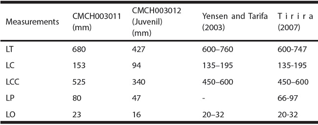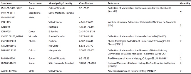 Recent studies (Escobar-Lasso and Guzman-Hernández 2014; Jimenez-Alvarado et al. 2016) confirm that there are few specimens deposited in Colombian scientific collections. A total of 18 specimens are currently recorded in collections, distributed in the Institute of Natural Sciences at Universidad Nacional de Colombia (ICN), the Museum of Natural History at Universidad del Cauca (MHNC), the Collection of Mammals at Instituto Alexander von Humboldt (IAvH-M), the Collection of Mammals at Universidad del Valle (CM-VC), and the Museum of Natural History at Universidad de Caldas, Manizales-Colombia (MHN-UC), in addition to some international museums in the U.S., including the Field Museum of Natural History, Chicago (FMNH), the National Museum of Natural History, the Smithsonian Institution (USNM), and the American Museum of Natural History (AMNH, Table 1).