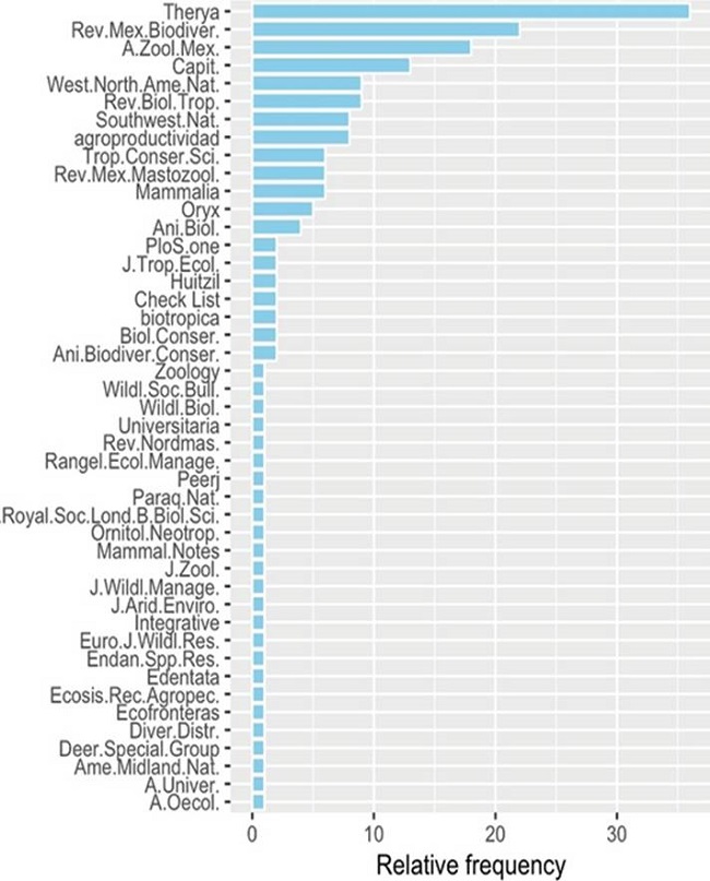 Temporal Trend and Journals. A total of 188 articles were gathered: 1 book, 6 book chapters and 181 articles published between 1998 and 2017; 88.2 % of these were published over the past 7 years (Figure 1). These articles were published in 50 journals: 9 national and 41 international journals; 76.1 % were published in the journals Therya, Revista Mexicana de Biodiversidad, Acta Zoológica Mexicana (new series), Revista de Biología Tropical, Western North American Naturalist, The Souhtwestern Naturalist, Agroproductividad, Tropical Conservation Science, Revista Mexicana de Mastozoología, Oryx, Mammalia, and Animal Biology (Figure 2).