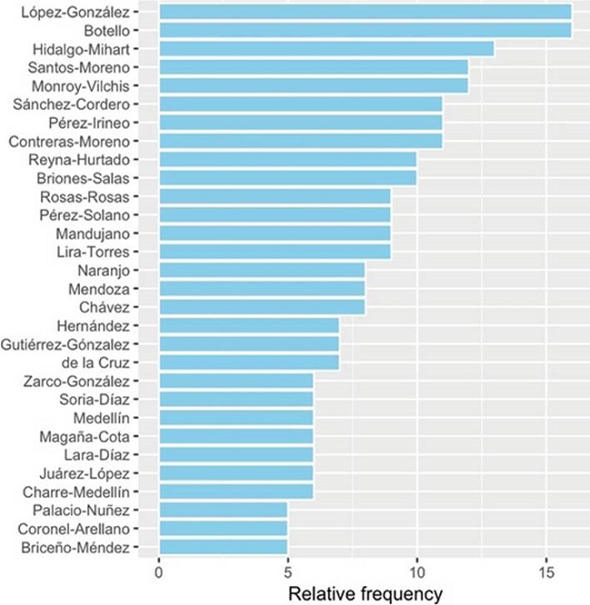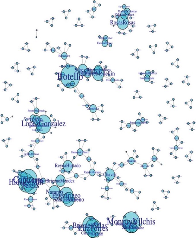 Authors. Articles were written by 406 co-authors from various Mexican and foreign institutions. According to their contribution, 28 authors published 5 or more articles, altogether accounting for 32.4 % of all articles published (Figure 3). This analysis yielded a relatively complex network of interactions between researchers (Figure 4). Research groups with some publications and little interaction with the rest are shown at the periphery of the network. In contrast, several clusters of work teams and their interaction with other groups appear to the center of the network. The major teams identified are: 1) Botello, Sánchez-Cordero, Charre-Medellín. 2) López-González, Lara-Díaz, Coronel-Arellano, Gutiérrez-González. 3) Hidalgo-Mirhart, Contreras-Moreno, de la Cruz, Pérez-Solano. 4) Reyna-Hurtado, Briceño-Méndez, Sandoval-Serés, Sanvicente-López. 5) Monroy-Vilchis, Soria-Díaz, Rodríguez-Soto. 6) Rosas-Rosas, Tarango-Arambula, Clemente-Sánchez, Palacio-Núñez, Hernández- SaintMartín. 7) Lira-Torres (r. i. p.), Briones-Salas. 8) Pérez-Irineo, Santos-Moreno. 9) Chávez, Ceballos. 10) Medellín, de la Torre.