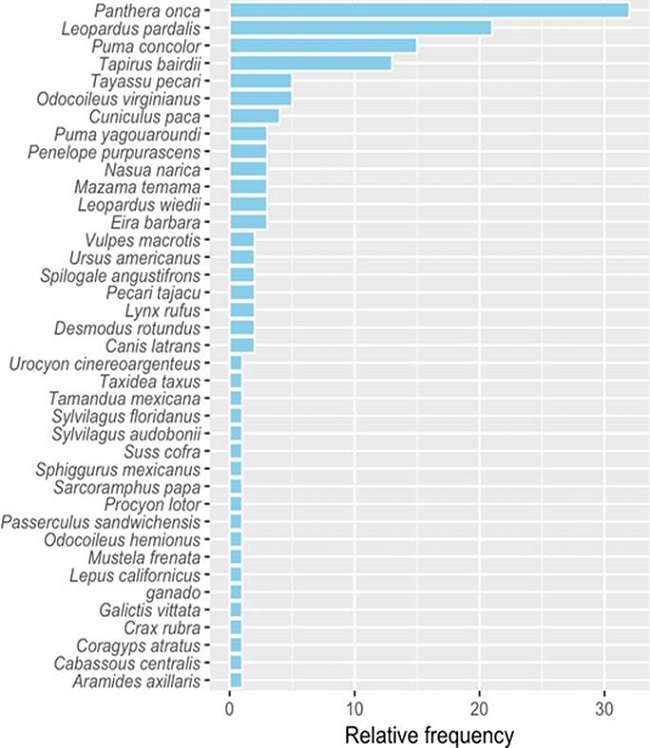 Species. A total of 40 species are reported in the title or in the abstract of publications involving photo-trapping, with felines and ungulates as the main groups. Particularly, Panthera onca, Leopardus pardalis, Puma concolor, Tapirus bairdii, Tayassu pecari, Odocoileus virginianus, and Cuniculus paca account for 55.1 % of articles (Figure 5).