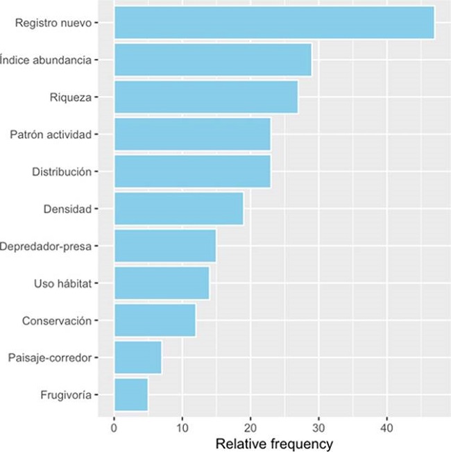 Main Topics. Photo-trapping studies cover a diverse range of topics. Most frequently, studies report new records, that is, when a species is recorded photographically in a site for the first time ever (Figure 6). Occasionally, these new records broaden the geographical distribution range. In order of frequency, these are followed by studies that report the number of species (richness) in a particular site or region, and the estimated population size measured as the index of relative abundance (IAR), density, and occupancy, activity patterns, and ecological interactions including predator-prey, frugivory, and parasitism. Also, photo-trapping has served to gather presence data for subsequent modeling of the potential geographic distribution.