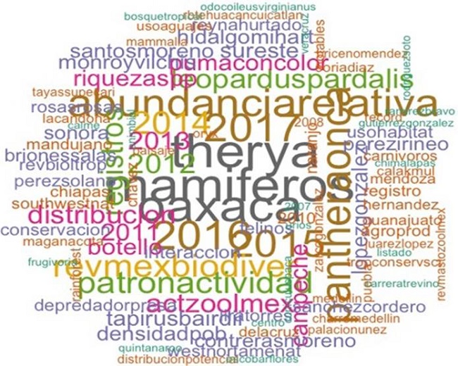 Abstract: This paper gathers published studies that used photo-trapping as the primary or supplementary method to obtain data on mammal and bird species in Mexico. The aim is to determine temporal trends, scientific journals, species, research groups, regions, and key topics investigated using this technology. A secondary objective of this paper was to illustrate the usefulness of text mining tools to analyze and summarize relatively large amounts of information. Papers about photo-trapping in Mexico published in specialized journals and books from 1998 to 2017 were compiled from Google Scholar and processed with various packages in R. A total of 188 papers about photo-trapping in Mexico were compiled, with 88.2 % published in 50 journals over the past seven years. The main journals were Therya, Revista Mexicana de Biodiversidad, Acta Zoologica Mexicana (New Series) and Revista de Biología Tropical. The articles identified were written by 406 co-authors, 28 of whom contributed with 32.4 % of the papers published. A total of 40 species were reported in the title and abstract of these papers; the most frequent species were Panthera onca, Leopardus pardalis, Puma concolor, Tapirus bairdii, Tayassu pecari, Odocoileus virginianus, and Cuniculus paca. Oaxaca, Campeche, Sonora, Chiapas, Guanajuato, and Puebla were the main states where studies were conducted; in particular, most of them were carried out within Biosphere Reserves. Major research topics comprised records that broaden the distribution range, estimates of relative abundance and density, analysis of activity patterns, ecological interactions between species, and use of photo-trapping data as supplementary information to elaborate inventories of species. The analysis of text mining clearly indicates a trend towards an increasing use of photo-trapping in Mexico. Felines, ungulates and various species of the order Carnivora are main subjects of study. Photo-trapping has been used to explore a number of aspects of the biology of animal species. A large number of studies have been carried out in southeastern Mexico. The use of text mining techniques is a practical approach to analyze large volumes of data.