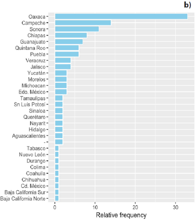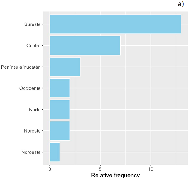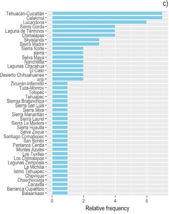 Regions, states, and natural areas. The regions with the largest number of studies using trap-cameras are located in the Southeast, followed by the Center; while fewer investigations have been conducted in the North (Figure 7a). In particular, Oaxaca is the state where the largest number of studies with this technology have been conducted, followed by Campeche, Sonora, Chiapas, Guanajuato, and Puebla, altogether accounting for 33.1 % of the total number of published articles (Figure 7b). A fact worth mentioning is that many studies have been carried out within or near Biosphere Reserves, reserve areas and similar zones, such as Tehuacán-Cuicatlán, La Lacandona, Calakmul, Los Chimalapas, Sierra Gorda, Laguna de Terminos, Sierra Norte, the so-called Sky Islands, Nanchichitla, El Cielo, and the Chihuahuan Desert (Figure 7c).
